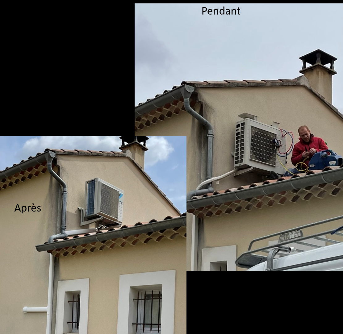 La durée d’intervention entre la dépose de l’ancien matériel que la société ASR-FLUIDELEC a conservé pour le recyclage, la pose de l'unité extérieure en pignon et de l’unité intérieure n’aura duré qu’une journée et demi, avec la mise en service et la prise en main.