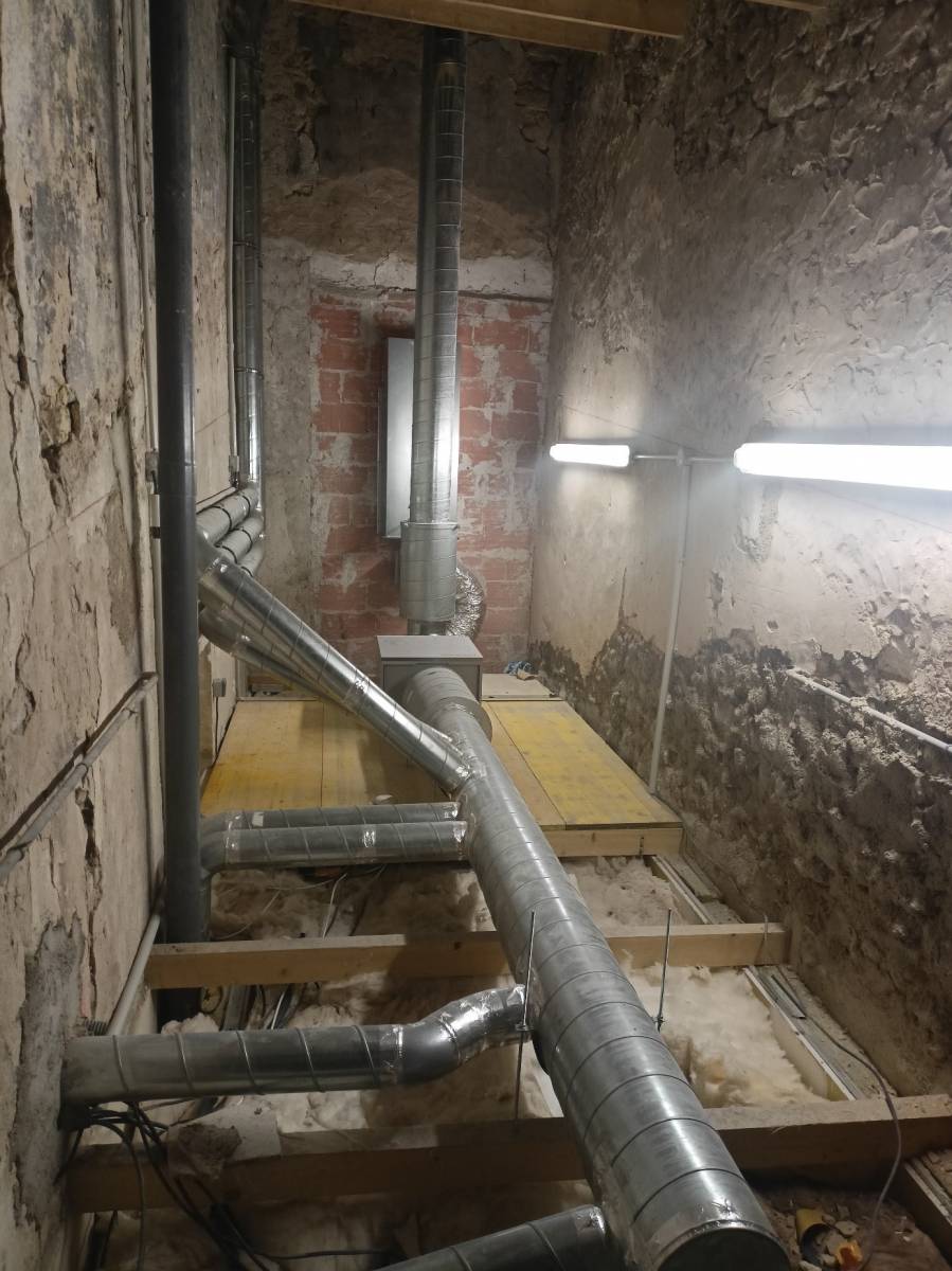 Les équipes d'ASR Fluidelec ont mis en place un système de ventilation spécifique du fait des contraintes acoustiques, réalisé l'ensemble de la distribution des câbles et posé les appareillages (luminaires LED, prises, éclairages de sécurité, radiateurs). En complément elles ont également réalisé la rénovation complète de la plomberie en distribuant de nouveaux réseaux et en équipant les locaux de sanitaires neufs.